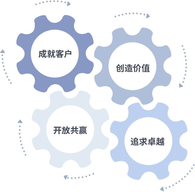 成就客户是一切决策的出发点,,,,创造价值是衡量所有工作的标准,,追求卓越是我们做事做人的态度,,,开放共赢是我们的格局也是最终的结果。。。价值观的齿轮环环相扣,,推动着组织里的每个人不断向前。。。